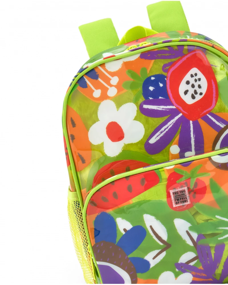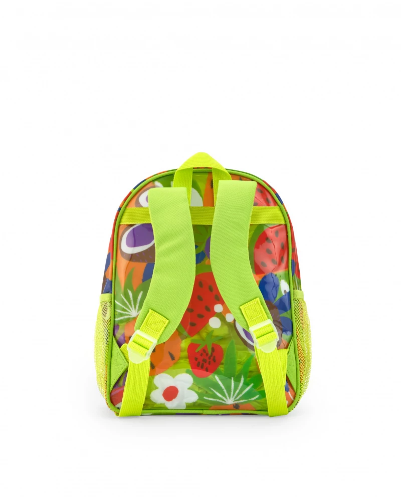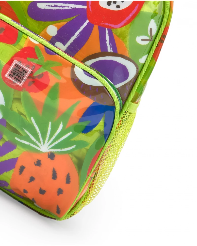 Έτοιμο για κάθε καλοκαιρινή περιπέτεια, αυτό το αδιάβροχο σακίδιο πλάτης είναι το απόλυτο αξεσουάρ για όλους! Διακοσμημένο με ζωντανό τροπικό print που περιλαμβάνει φρούτα και φυσικά στοιχεία, συνδυάζει τη χαρούμενη εμφάνιση με τη μέγιστη πρακτικότητα.
