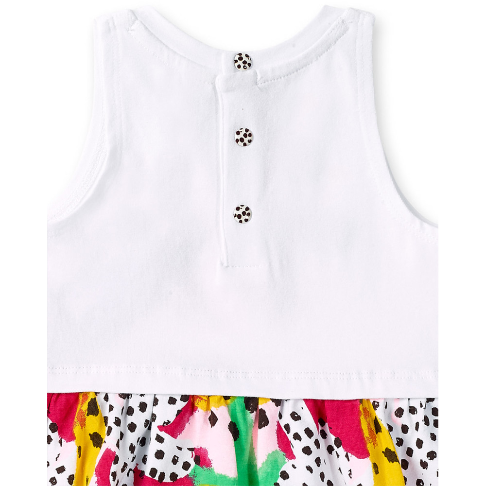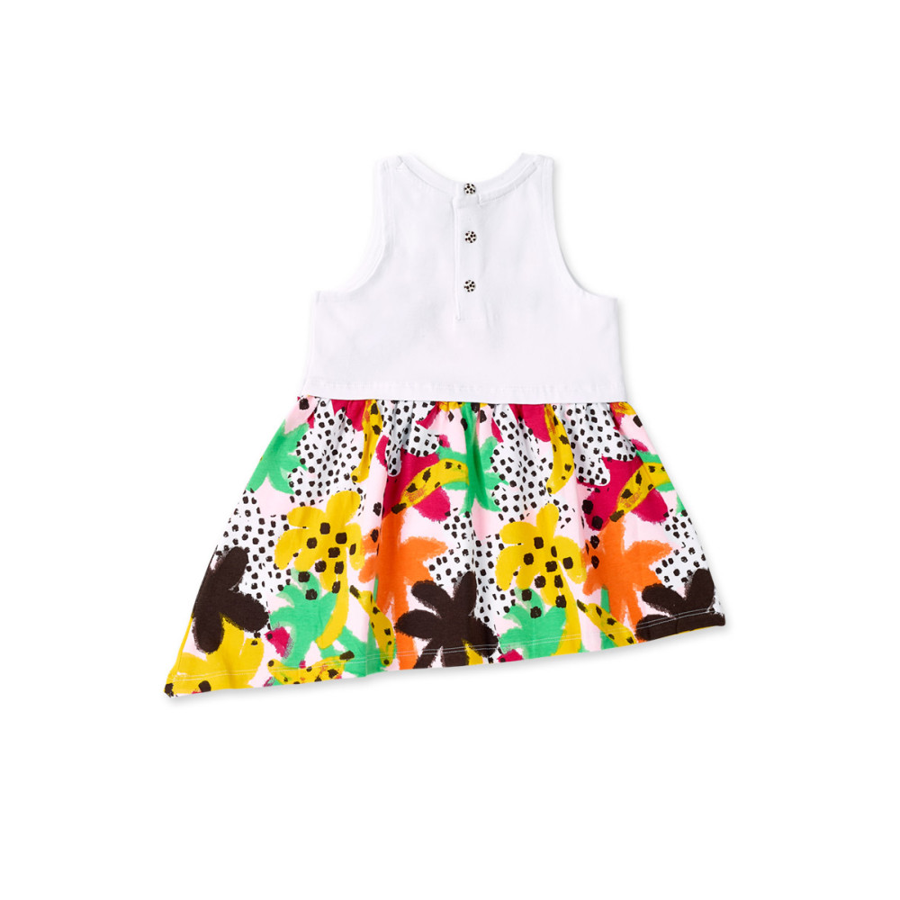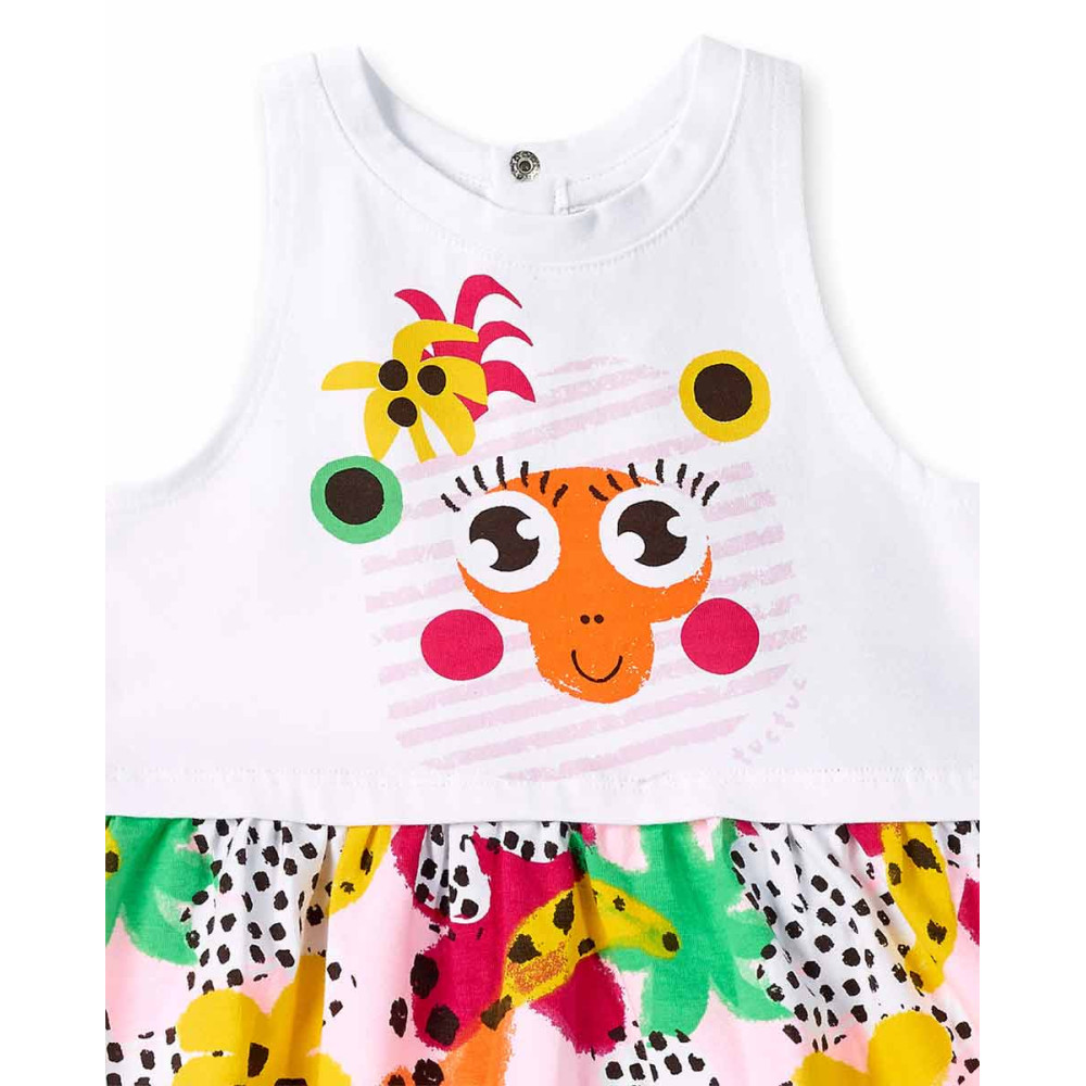 Ένα φόρεμα γεμάτο φαντασία και ζωντάνια! Το επάνω μέρος κοσμεί ένα γλυκύτατο λιονταράκι με χαμόγελο και παιχνιδιάρικα μαγουλάκια, ενώ την παράσταση κλέβει το tropical print σε έντονα, χαρούμενα χρώματα! Φτιαγμένο από μαλακό βαμβάκι, ιδανικό για καλοκαιρινές βόλτες και φωτογραφίες που θα μείνουν αξέχαστες! 💛✨