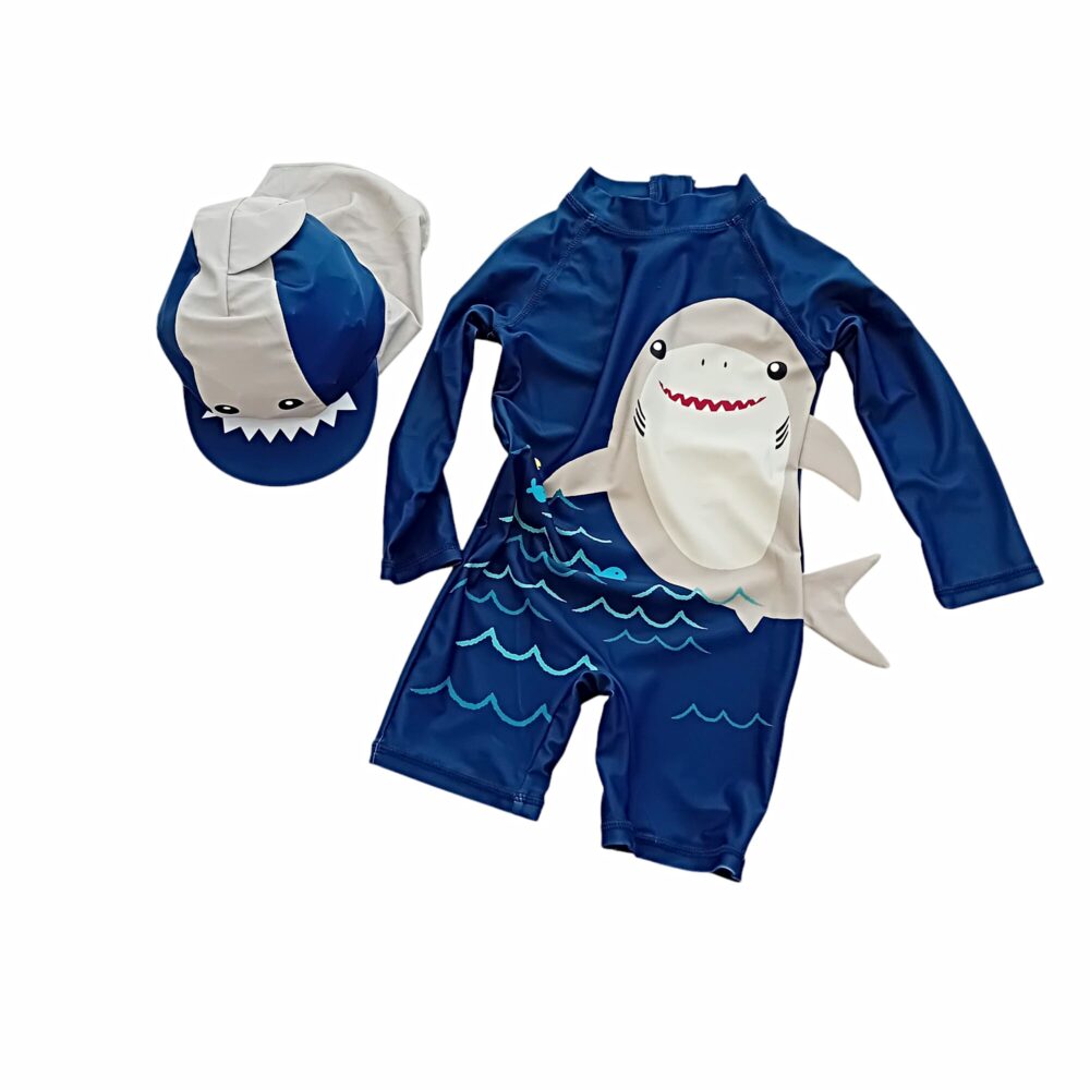 Ολόσωμο μπλε μαγιό τύπου σερφ με εντυπωσιακό σχέδιο καρχαρία στο μπροστινό μέρος.