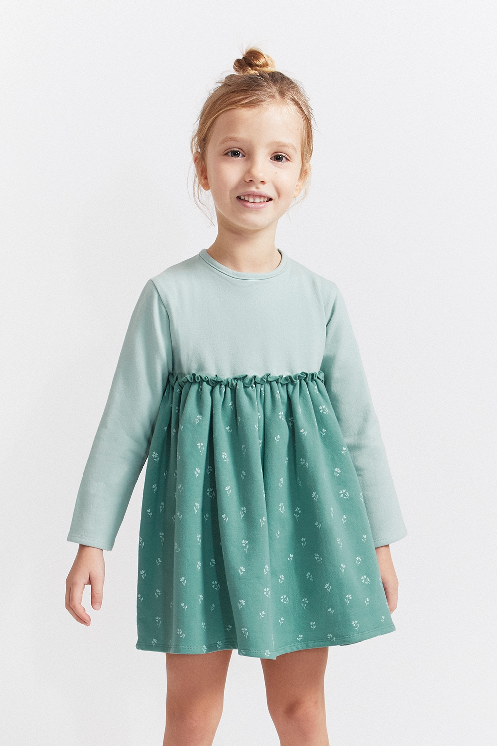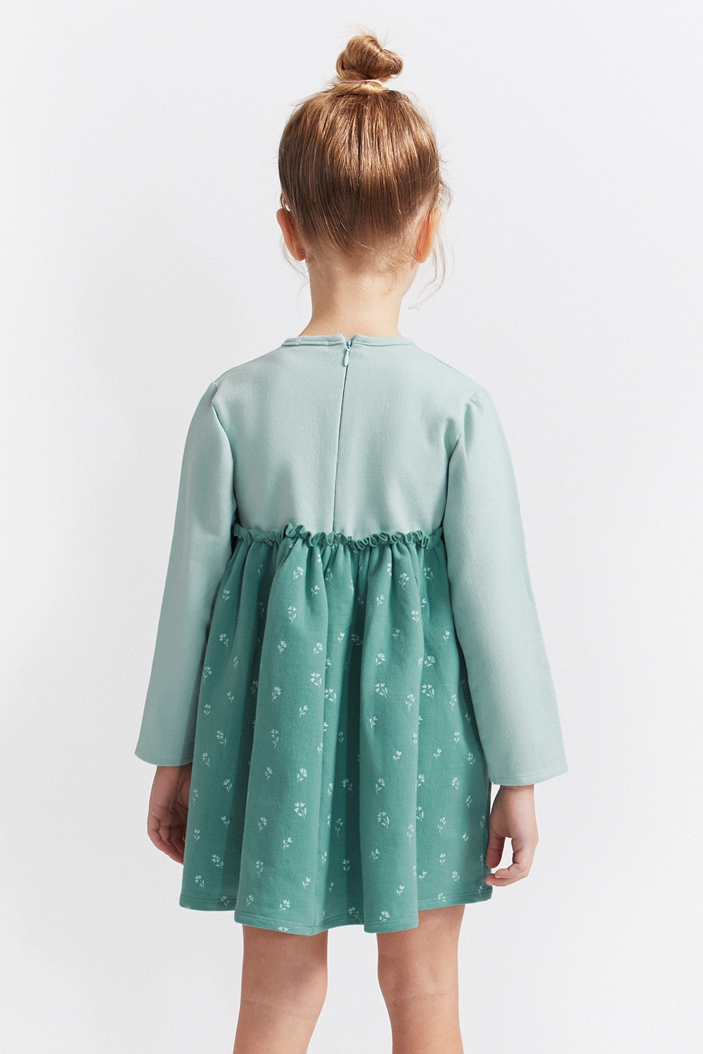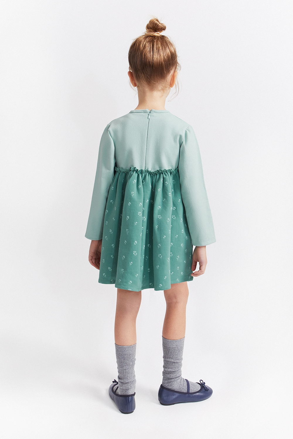 Ένα κομψό παιδικό φόρεμα σε απόχρωση mint green, που συνδυάζει μοντέρνο στυλ με άνεση. Το πάνω μέρος είναι μονόχρωμο με μακρύ μανίκι, ενώ η φούστα διαθέτει διακριτικό φλοράλ μοτίβο που χαρίζει παιχνιδιάρικη διάθεση. Ιδανικό για καθημερινές εμφανίσεις αλλά και πιο ιδιαίτερες περιστάσεις, προσφέροντας ελευθερία κινήσεων και στυλ.