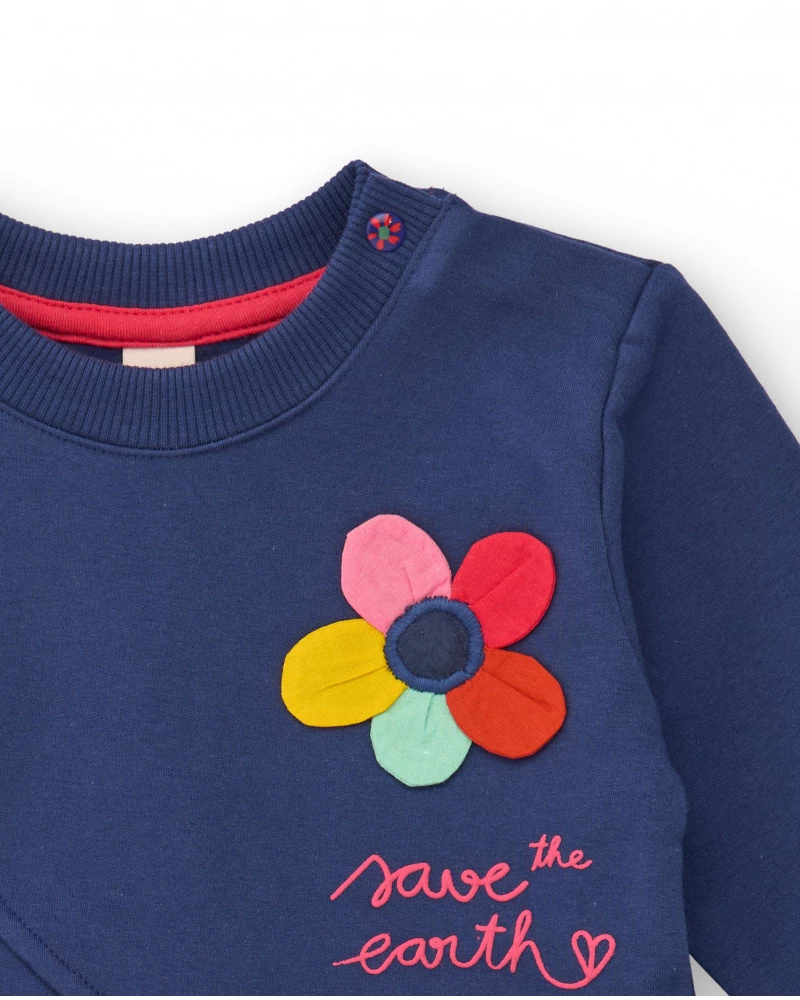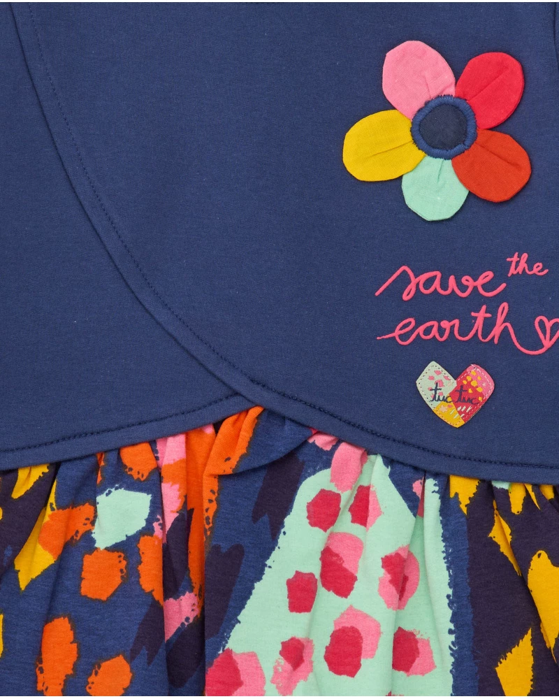 Υπέροχο παιδικό φόρεμα με μπλε επάνω μέρος και πολύχρωμη φούστα με έντονα σχέδια που γεμίζουν ζωντάνια. Στο πάνω μέρος ξεχωρίζει λουλουδάκι με απλικέ λεπτομέρειες και το μήνυμα Save the Earth, που χαρίζει παιχνιδιάρικο και ταυτόχρονα μοντέρνο χαρακτήρα. Ένα άνετο και κομψό σύνολο για καθημερινές αλλά και πιο ξεχωριστές εμφανίσεις, πάντα με την ποιότητα της TUC TUC.