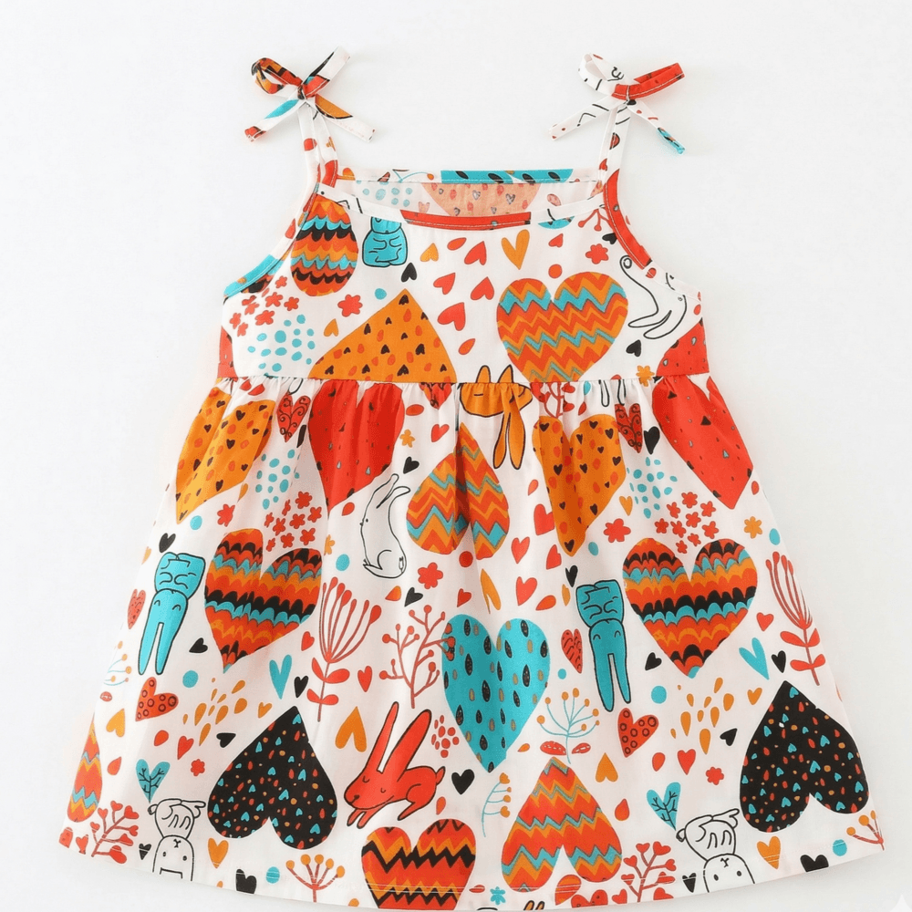 Ένα ζωηρό και γεμάτο φαντασία φόρεμα που κερδίζει τις εντυπώσεις με τα πολύχρωμα σχέδιά του. Οι καρδιές, τα παιχνιδιάρικα ζωάκια και τα ιδιαίτερα μοτίβα δημιουργούν ένα μοναδικό αποτέλεσμα που ξεχειλίζει από χαρά και δημιουργικότητα. Οι τιράντες με τα φιογκάκια προσφέρουν μια έξτρα γλυκιά λεπτομέρεια, ενώ η άνετη γραμμή χαρίζει ελευθερία κινήσεων σε κάθε δραστηριότητα. Ιδανικό για καλοκαιρινές εμφανίσεις που θέλουν να ξεχωρίζουν με στυλ και ζωντάνια.