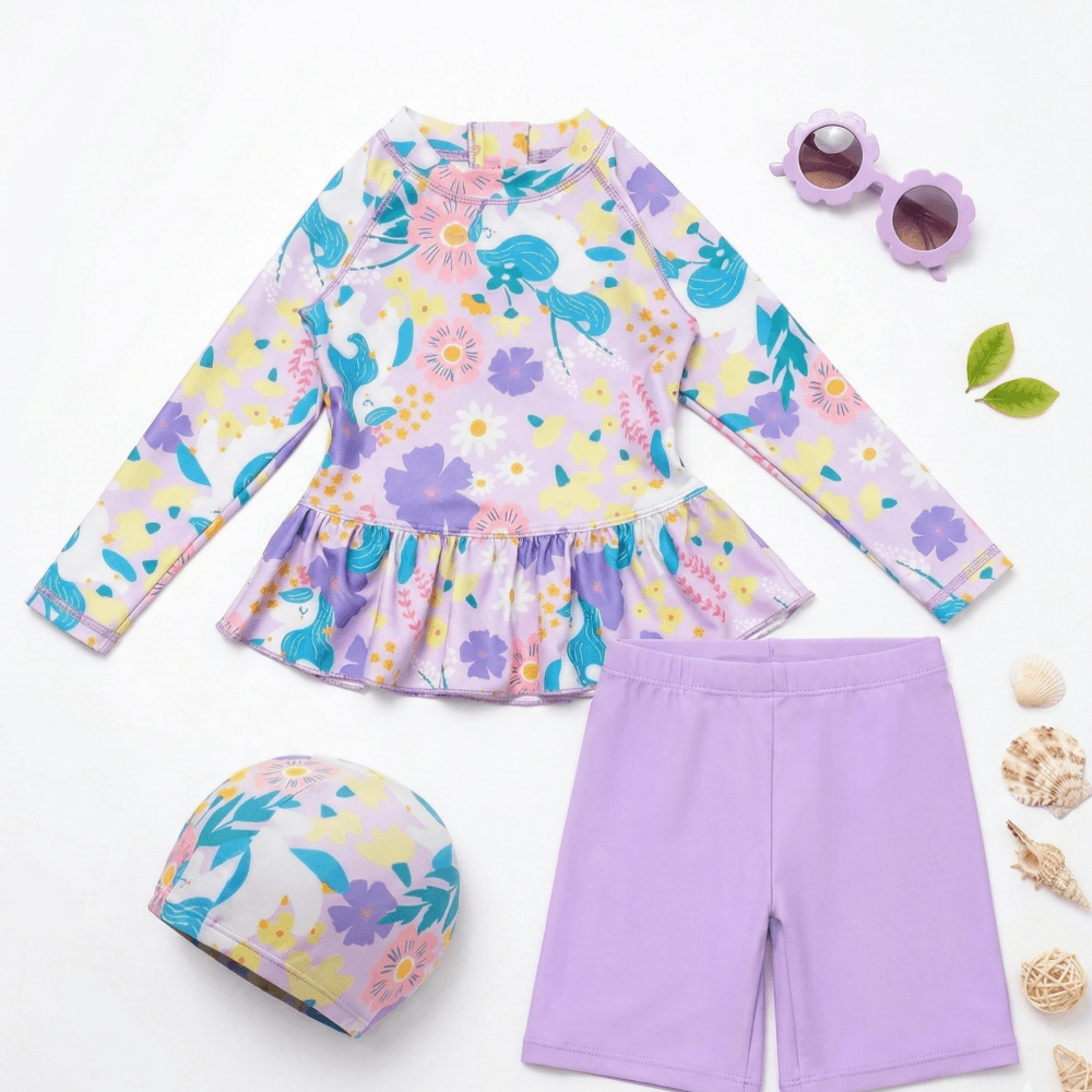 Παιδικό Μαγιό Σετ Μακρυμάνικο με Σορτσάκι & Καπελάκι Floral