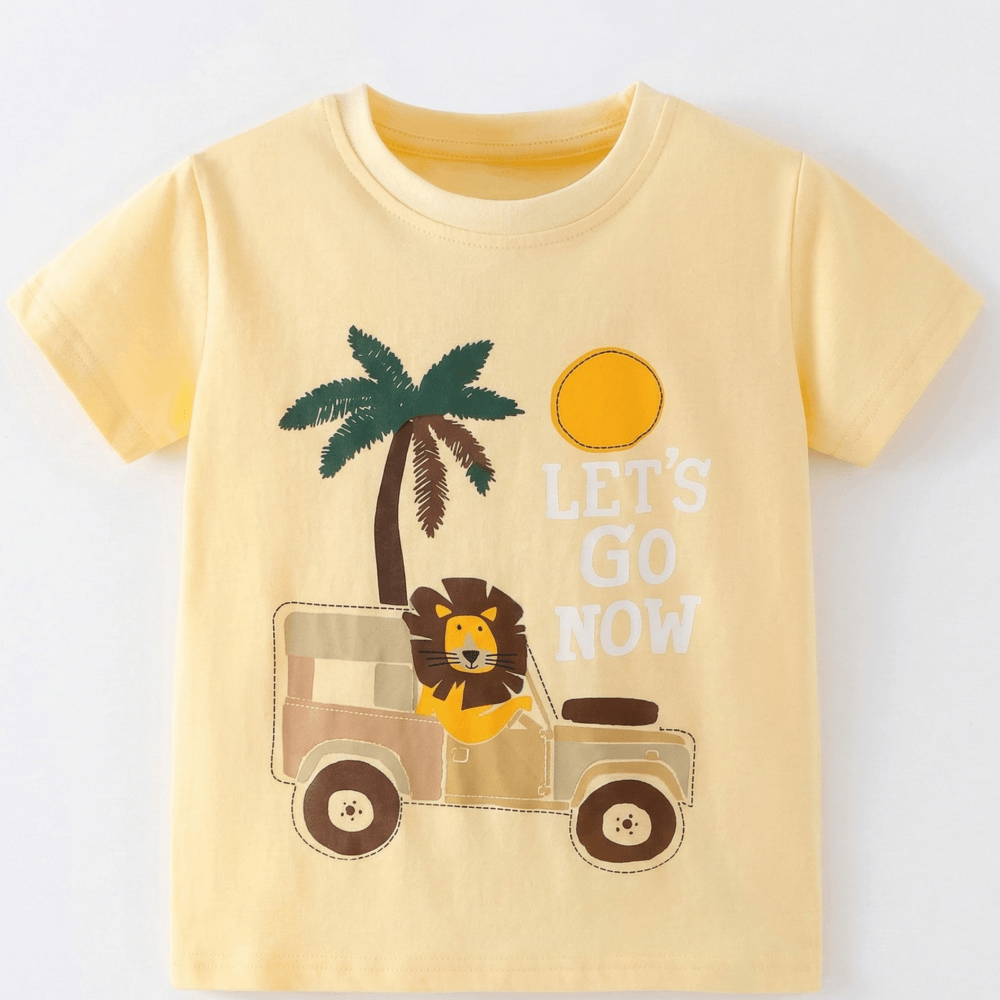 Παιδικό κοντομάνικο μπλουζάκι σε απαλό κίτρινο χρώμα με τύπωμα λιονταράκι σε αυτοκίνητο και καλοκαιρινό σχέδιο με φοίνικα και ήλιο. Το σχέδιο δίνει χαρούμενο χαρακτήρα και είναι ιδανικό για καθημερινή χρήση.