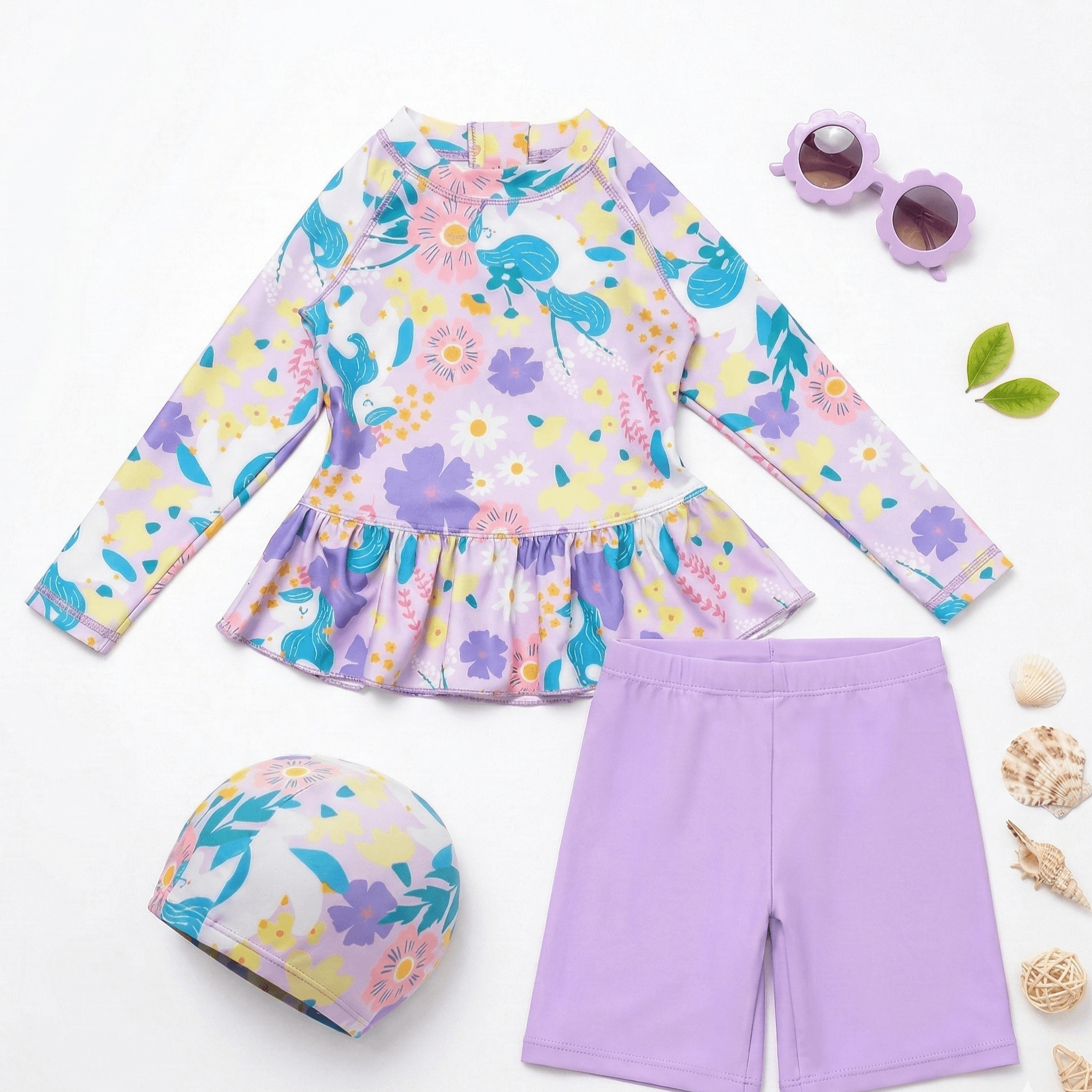 Παιδικό Μαγιό Σετ Μακρυμάνικο με Σορτσάκι & Καπελάκι Floral