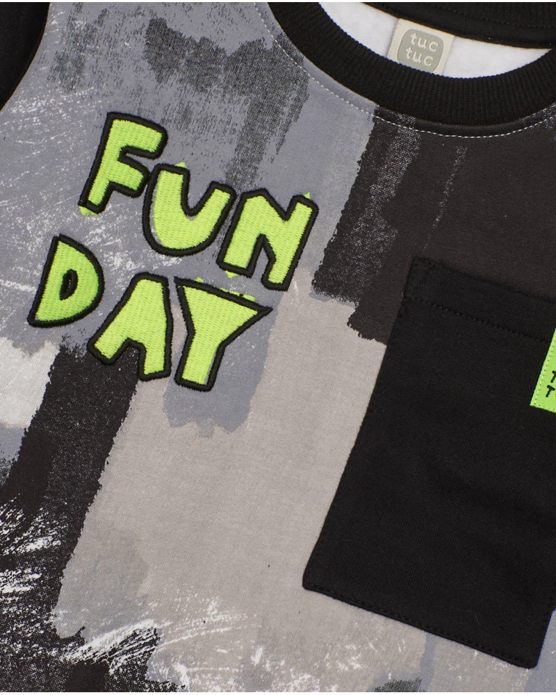 Σετ TUC TUC με μοντέρνα διάθεση που περιλαμβάνει μπλούζα σε μαύρο-γκρι με τύπωμα “FUNDAY” και τσέπη με πράσινη λεπτομέρεια, καθώς και άνετο παντελόνι φόρμας με φερμουάρ στο πλάι. Ένα πρακτικό και στιλάτο outfit που συνδυάζει άνεση και ξεχωριστό design, ιδανικό για τις καθημερινές δραστηριότητες των παιδιών.