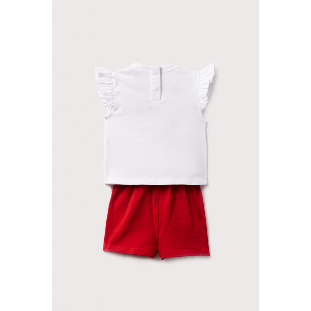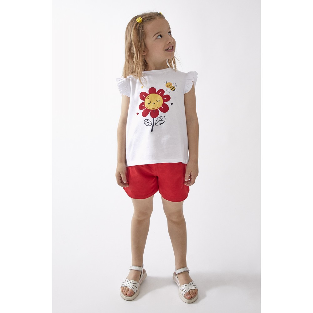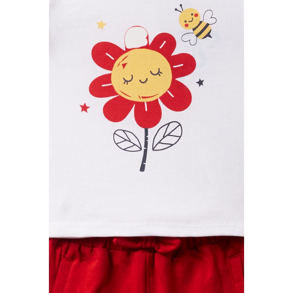 Ανοιξιάτικο και χαρούμενο σετ της εταιρείας STREET MONKEY, με λευκή μπλούζα που διακοσμείται με ένα γλυκό λουλουδάκι και μια μέλισσα, και κόκκινο σορτσάκι με άνετη γραμμή. Τα βολάν στα μανίκια δίνουν μια παιχνιδιάρικη πινελιά, ενώ η άνετη εφαρμογή το καθιστά ιδανικό για καθημερινή χρήση από δραστήριες μικρές κυρίες. 🌼🐝
