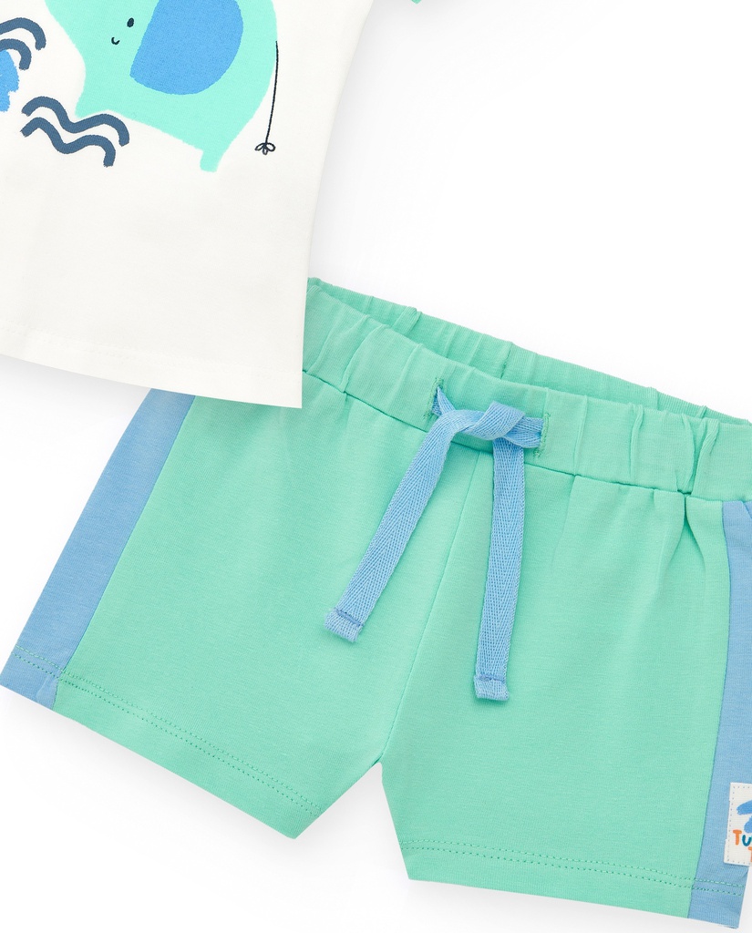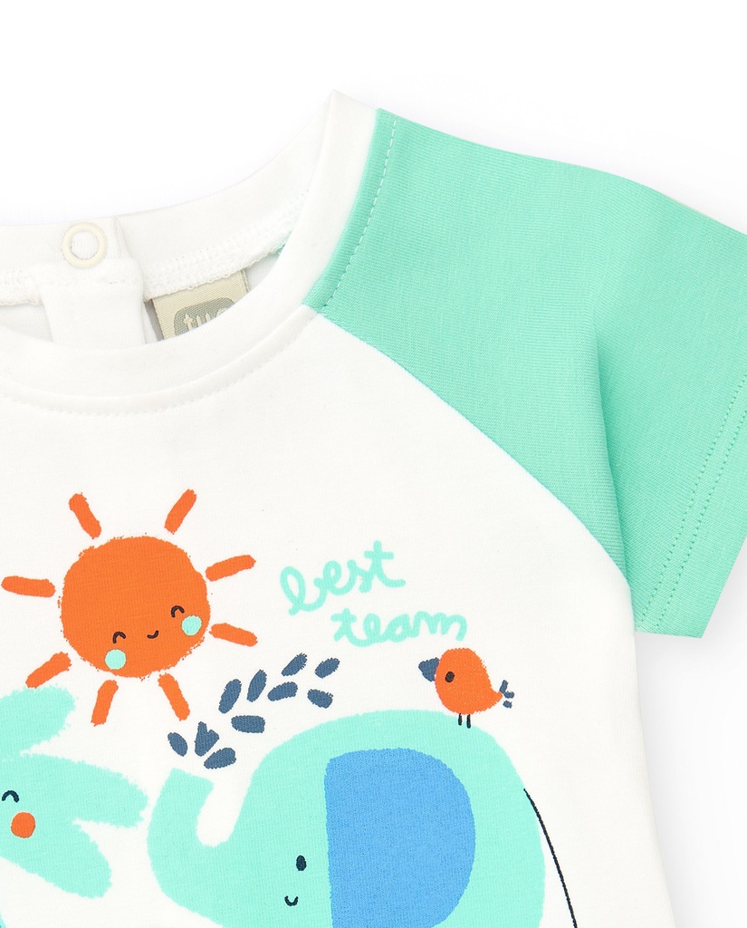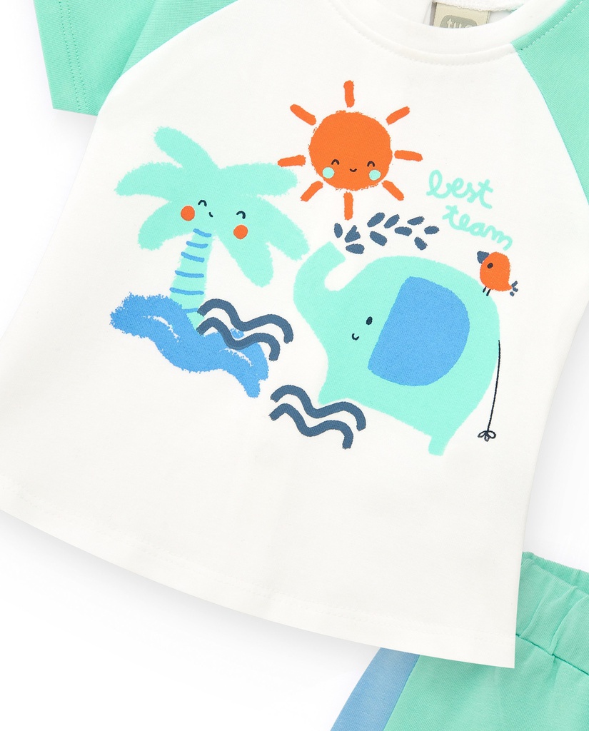 Ένα παιχνιδιάρικο και άνετο σετάκι, μπλουζάκι με βερμούδα για τις καλοκαιρινές εμφανίσεις του μικρού σας! Διαθέτει χαριτωμένο σχέδιο με ένα χαμογελαστό ελέφαντα, φοίνικα και ήλιο, σε ζωηρά χρώματα πράσινο,μπλε και πορτοκαλί. Κλείσιμο με κουμπάκια στο πίσω μέρος της μπλούζας για εύκολη αλλαγή.