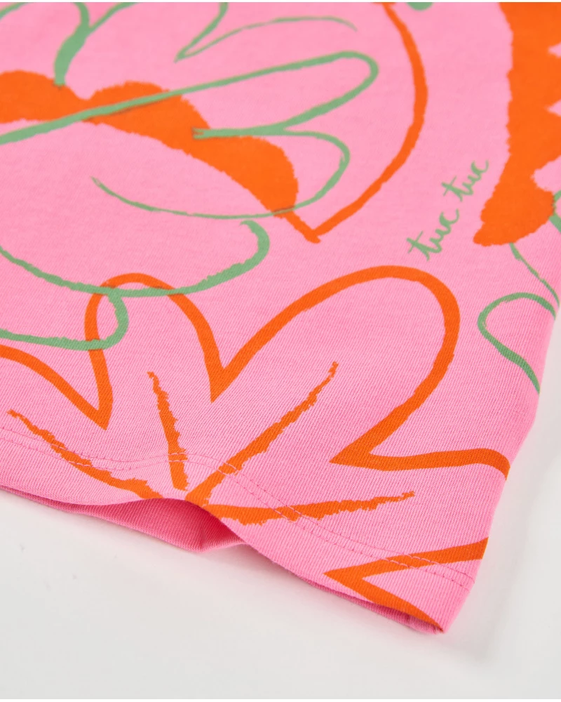 Μια μπλούζα γεμάτη χαρά και φαντασία, όπως μόνο η TUC TUC ξέρει να δημιουργεί! Το ζωηρό ροζ φόντο γίνεται ο ιδανικός καμβάς για το παιχνιδιάρικο δεινοσαυράκι και τα πολύχρωμα φύλλα που απλώνονται σε όλη την επιφάνεια. Το σχέδιο είναι τολμηρό, μοντέρνο και απόλυτα καλοκαιρινό, κάνοντας τη μπλούζα να ξεχωρίζει σε κάθε εμφάνιση.