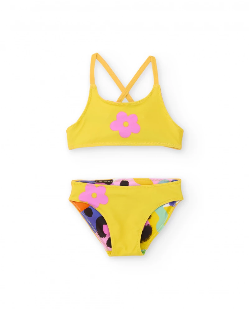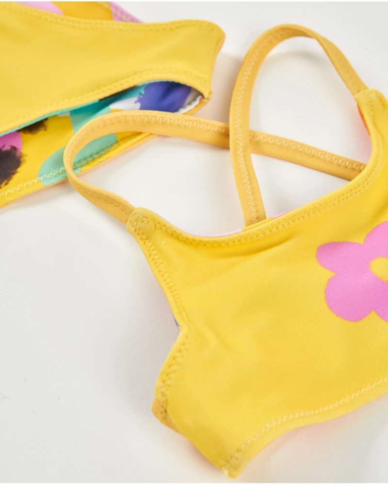 Παιδικό μπικίνι της TUC TUC σε πρακτική διπλή όψη: μία πλευρά με ζωηρό, αφηρημένο πολύχρωμο μοτίβο και μία ακόμη σε φωτεινό κίτρινο με χαριτωμένη λουλουδάτη λεπτομέρεια. Ιδανικό για ατελείωτο καλοκαιρινό παιχνίδι, προσφέρει δύο εμφανίσεις σε ένα, ενώ το απαλό και ελαστικό ύφασμα εξασφαλίζει άνετη εφαρμογή σε κάθε δραστηριότητα.